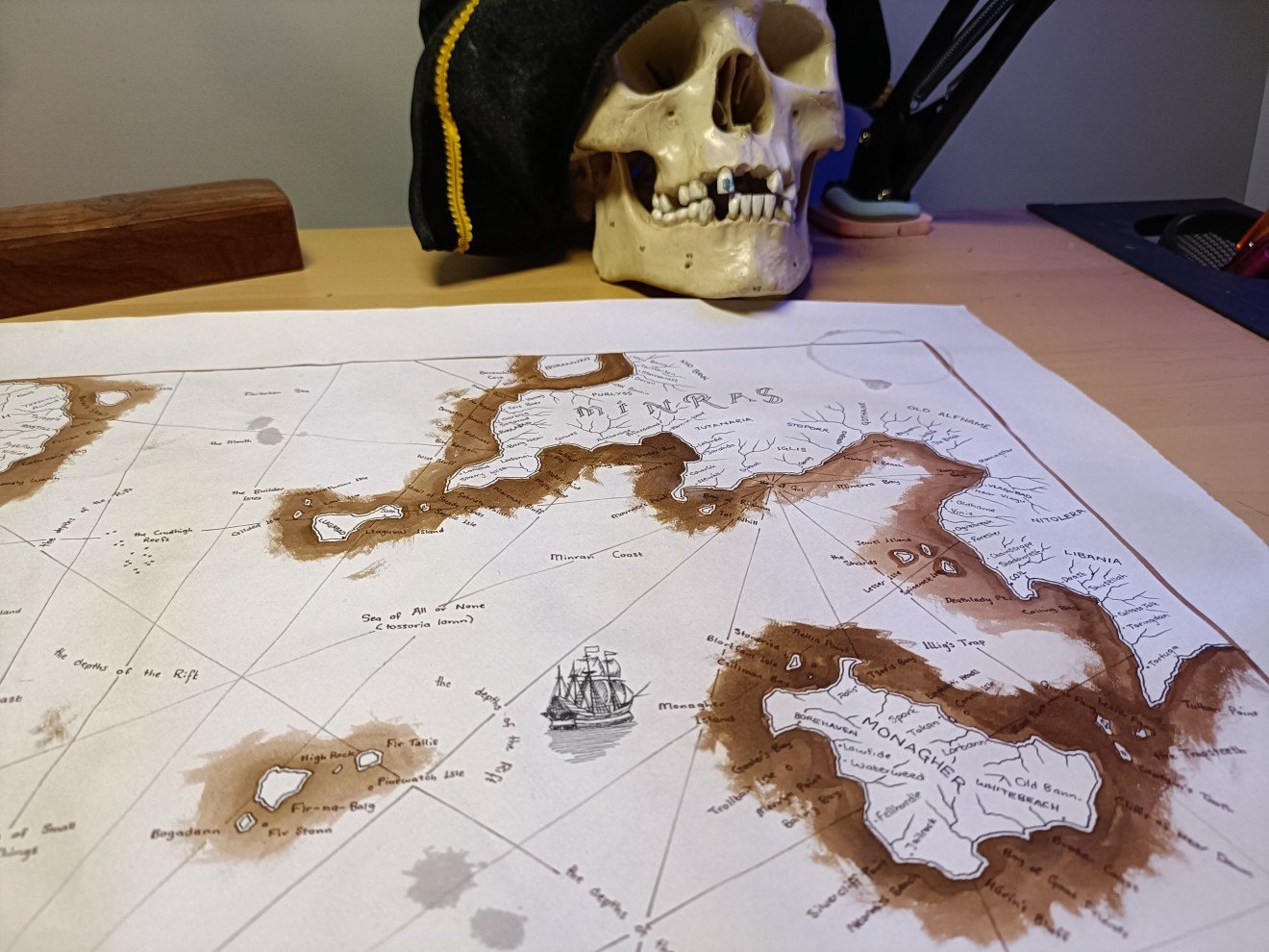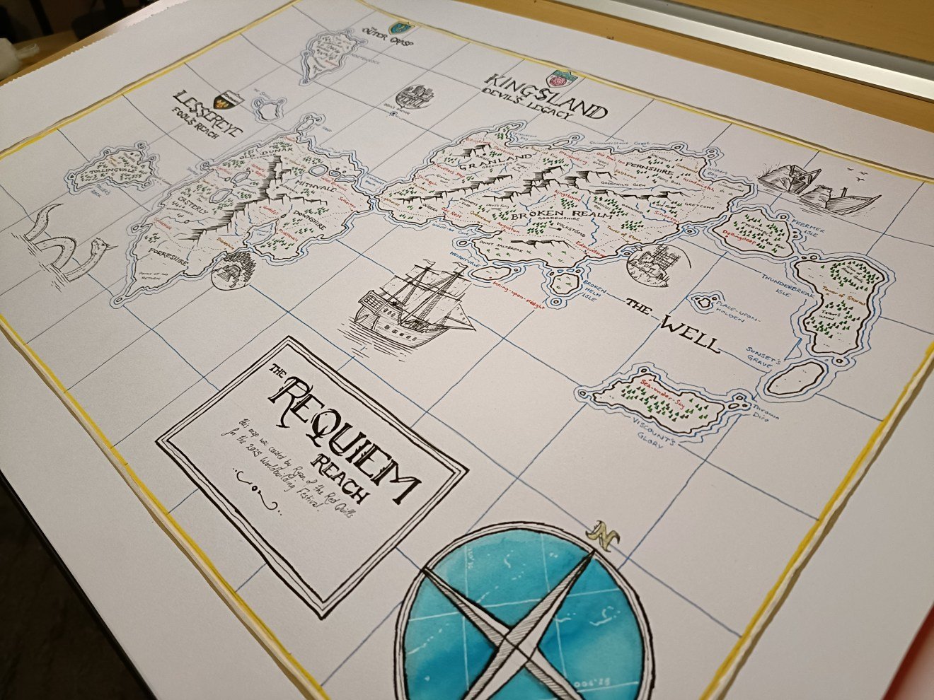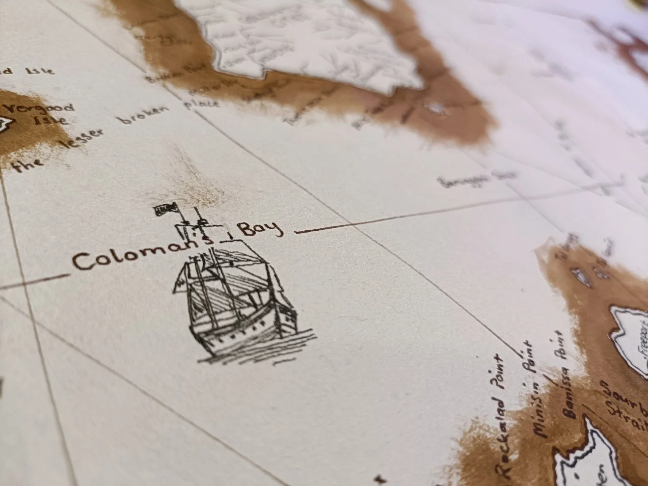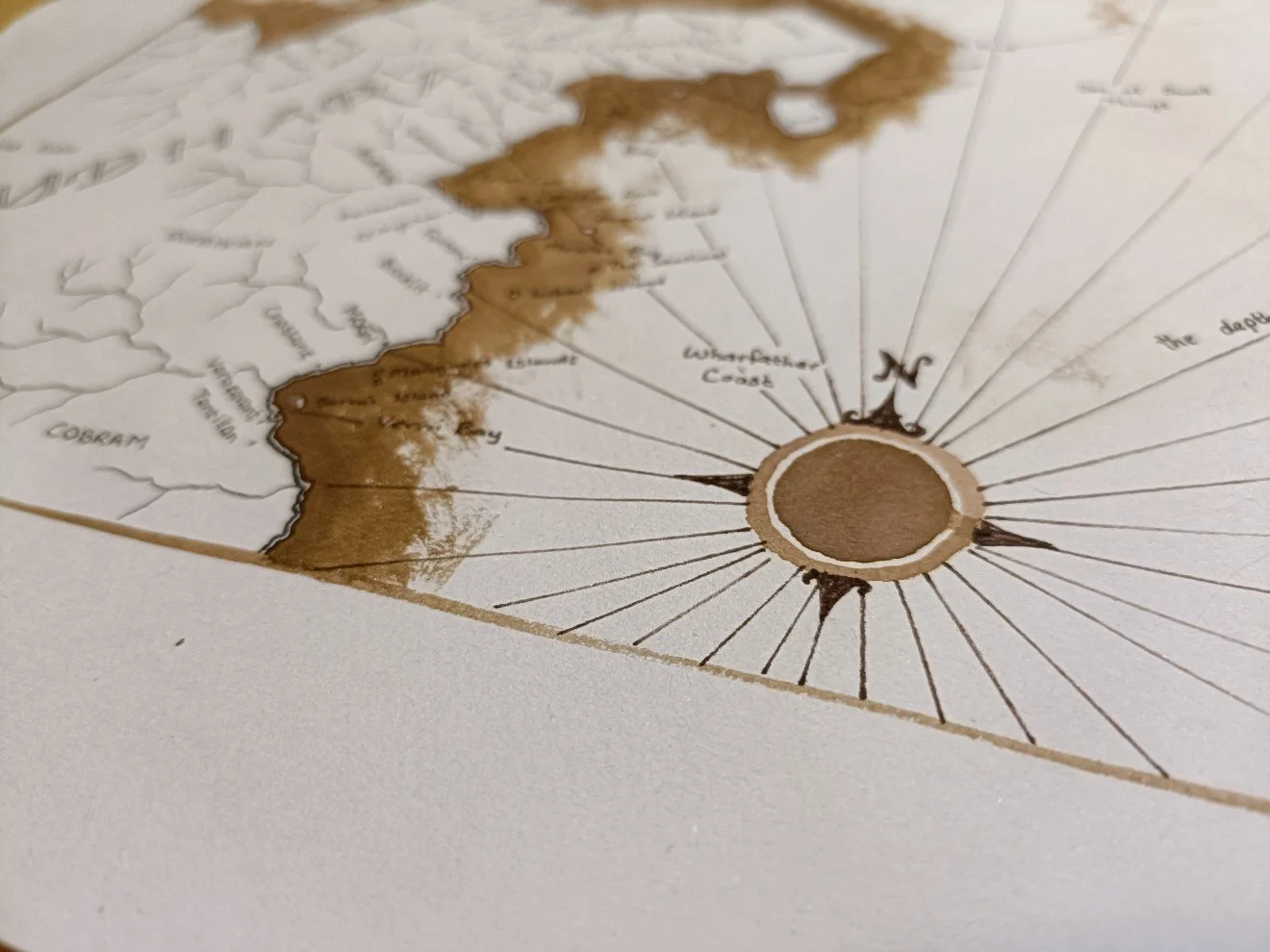 Each commission begins with your world: its history, its conflicts, its quiet details. From there, geography, culture and story weave together into a map that feels intentional, grounded, and lived-in. These maps are made to be handled, referenced, travelled. Hung on a wall or spread across a table, they hold the practical weight of a tool but the presence of an artwork.