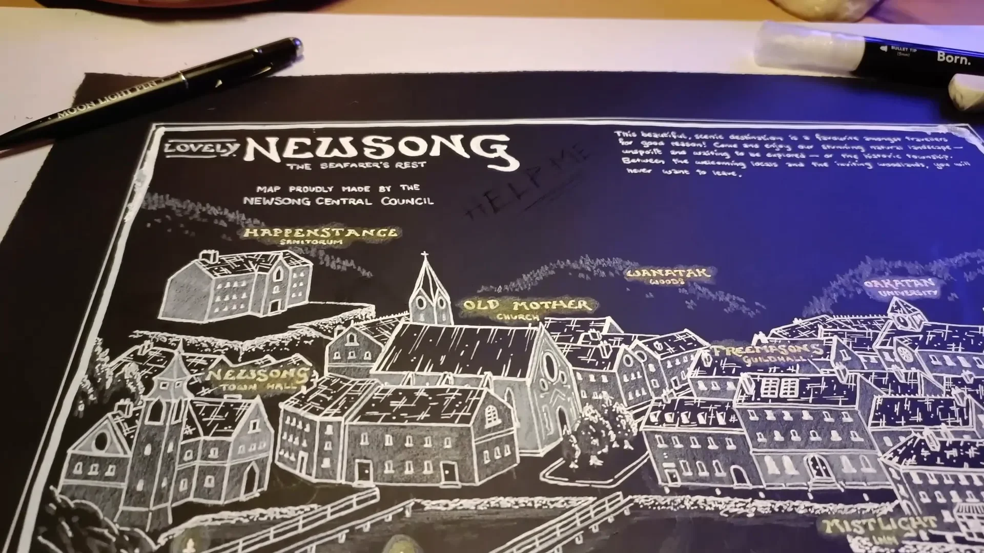 In my case I added more layers of white pencil to the landmark buildings (the university, the lighthouse, the guild hall) so they popped relative to the dense smaller buildings. This created visual hierarchy and helped the eye prioritize places your players are likely to visit. When working on your lovecraftian map you should also: