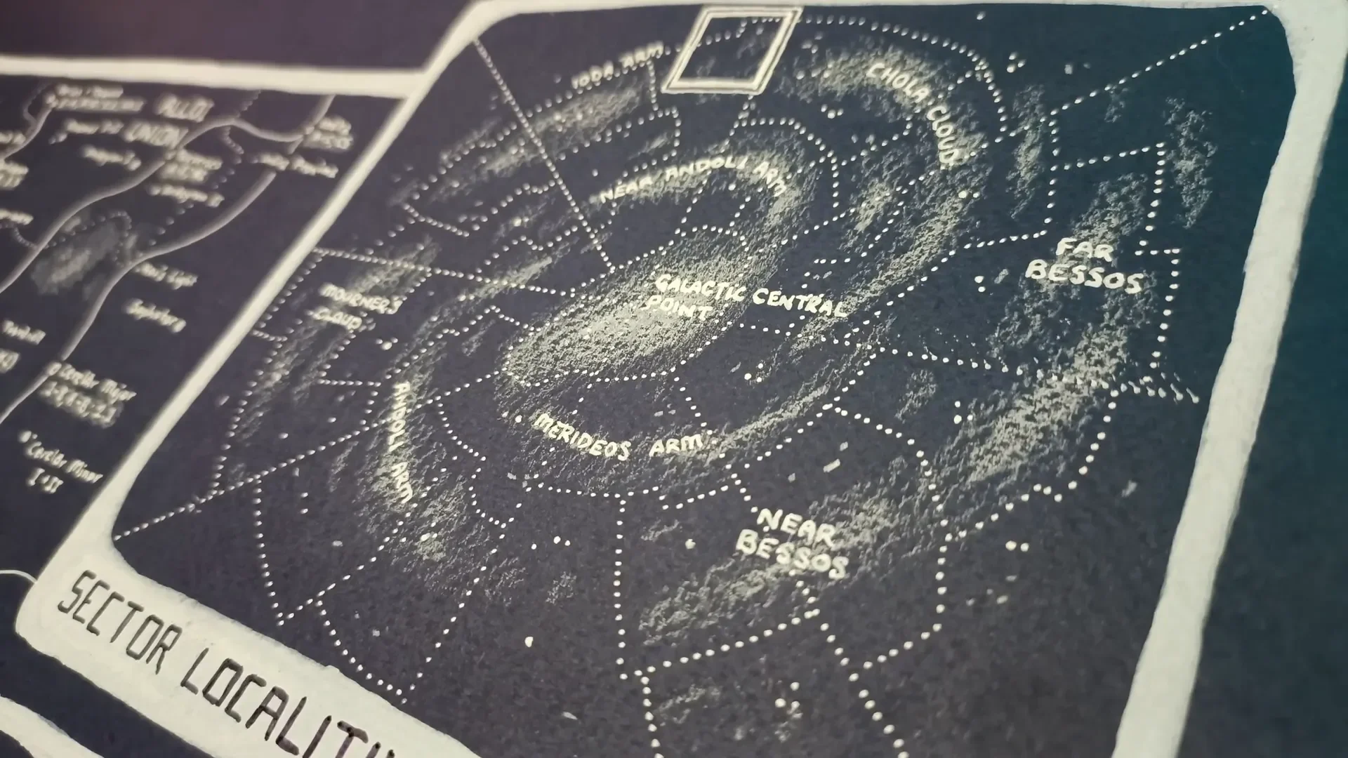 - A galactic inset showing a spiral galaxy with the sector highlighted — this gives context to the players about how far from the galactic core they are.